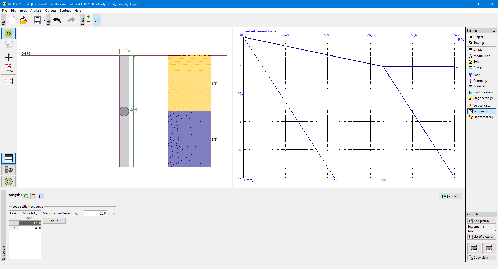 The "Settlement" frame serves to display the pile load-settlement curve. More computations can be performed in the frame.
