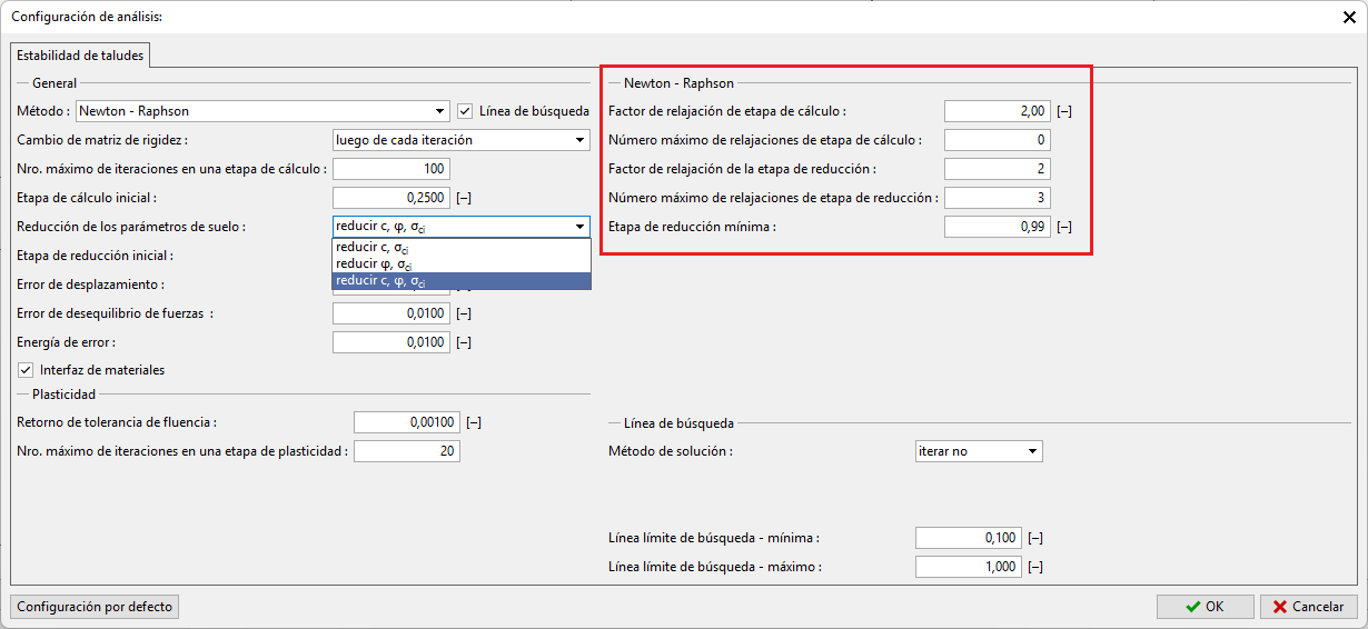 De manera similar al análisis estándar el programa ajusta el valor del factor de reducción. Ofrece la solución no convergente para un determinado conjunto de parámetros c, φ, el factor de reducción se relaja y el análisis se reinicia. Este enfoque es dirigido por los parámetros configurados en "Configuración de análisis" - solapa Newton Raphson.