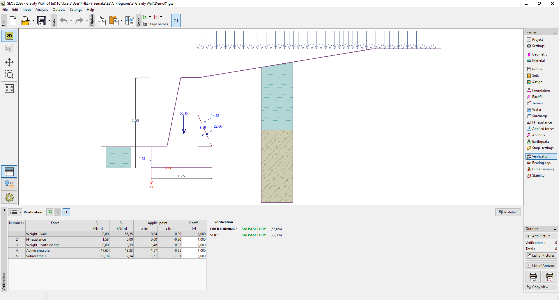The computed forces are displayed on the desktop and are automatically updated with every change of input data and setting. The right part of the frame shows the result of wall verification against overturning and translation. The "In detail" button opens the dialog window, which contains a detailed listing of the verification analysis results.