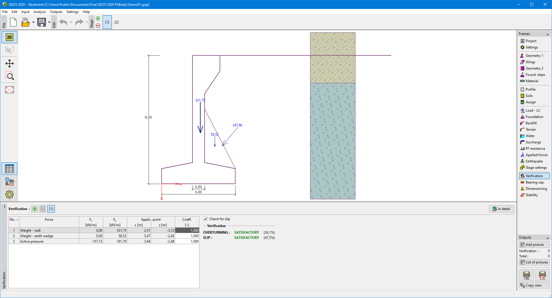 The computed forces are displayed on the desktop and are automatically updated with every change of input data and setting. The right part of the frame shows the result of verification of a wall against overturning and translation. The "In detail" button opens the dialog window, which contains a detailed listing of the results of verification analysis.