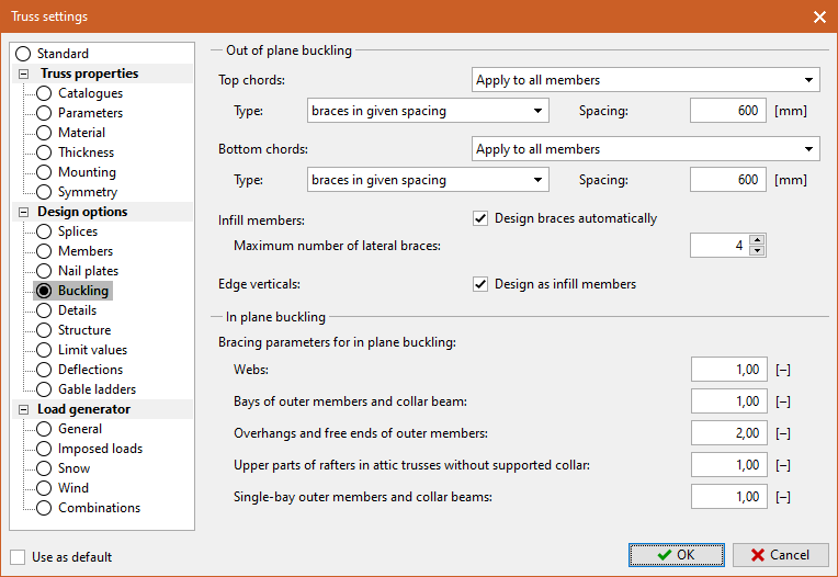 This section is focused on the out of plane buckling properties of the truss, i.e. in the direction where the stability of the structure is provided by the lateral bracing. The settings located here therefore affect the positioning of the lateral braces.